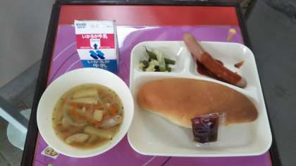 コッペパン 牛乳 ウインナーのケチャップソース スープ