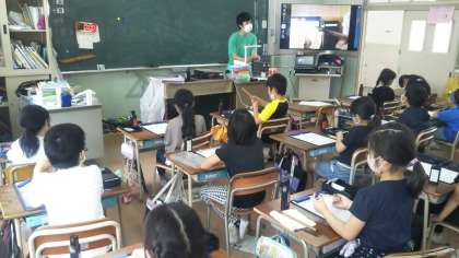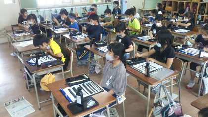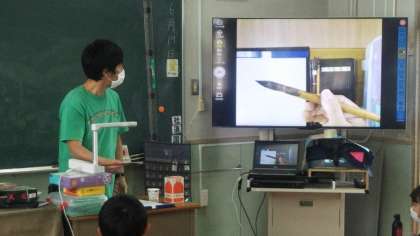 1組では筆の使い方など手元の動きを大型ディスプレイに映し出して指導が行われました。