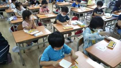 1年生は図画工作の時間に“パス”の使い方を練習したあと、1人1人が“えがお”の絵を描き、全員の分が描きあがり、教室に掲示されました。