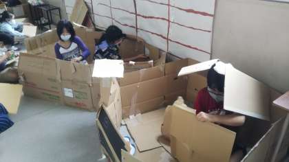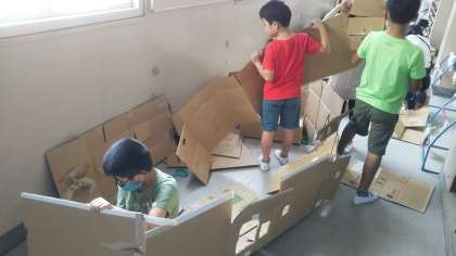 3年1組は図画工作の学習の導入として、段ボールを使った“まちづくり”をクラス全員で取り組んでいます。