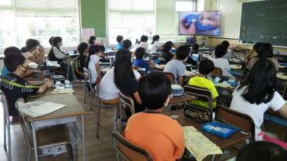大型ビジョンの映像や先生のお手本も参考にしながら進めていきます。