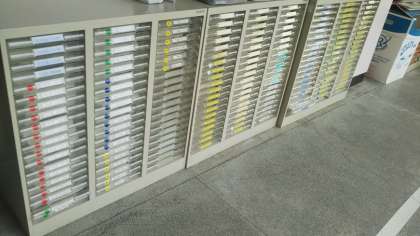 西淡路小学校の職員室前には、たくさんのプリントが入ったレターケースが並んでいます。
