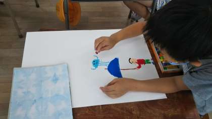 次に4つ切り画用紙に、形も色も様々な傘を持った“自分”をパスで描いてきます。そこに、一緒に遊ぶ“なかま”を描いていき、雨の日も楽しく過ごしている様子を表毛していきます。