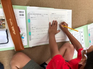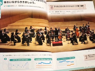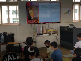 今日の鑑賞曲は「アイネクライネナハトムジーク」です。聞いたことがあるような、ないような・・モーツアルトが作曲した曲です。曲をきけば「あっ!知ってる。」となるのですが、クラシックをきく機会が少ない子どもたちにとっては少し難しかったようです。それでも先生がモーツアルトの生い立ちや作った曲について説明すると「すげー!」と興味津々でした。