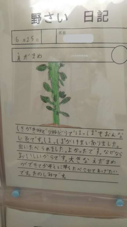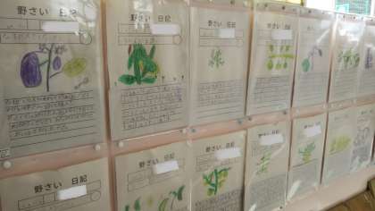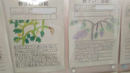 なすやミニトマト、えだまめなど、1人1人が育てた苗の成長の様子をしっかりと観察し“野さい日記”として残しています。