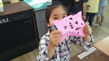 色紙を何回か折り曲げて、そこにはさみを入れていき、色紙を開けてみると…、