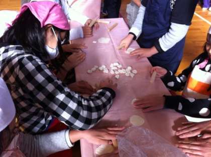 現在は、ギョーザ作りに挑戦中、餃子の皮を粉の状態から水を入れて練り、よく見る丸い形にして、今は具を包んでいます。