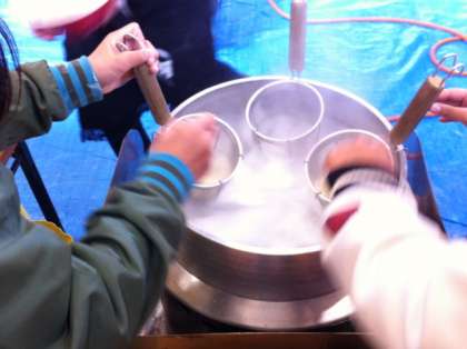 ラーメンの生地を麺にする機械を使っていますが、なかなか力がいるようです。