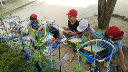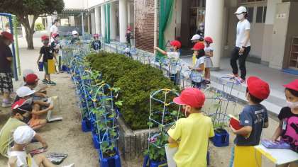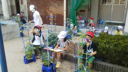 コロナウィルスの影響で学校がお休みになり、種まきの時期が例年より遅くなったことと、長雨の影響で例年より花の咲く時期が遅くなっていますが、子どもたちが一生懸命にお世話をして、ぐんぐんつるを伸ばして、順調に成長しています。