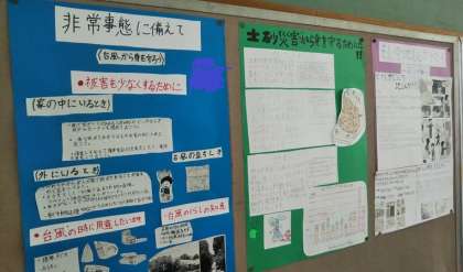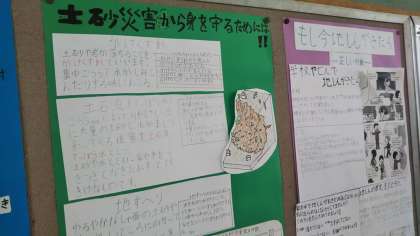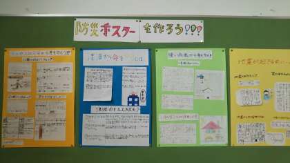 6年生が国語の時間に作った「防災ポスター」が教室や廊下の掲示板に貼られています。