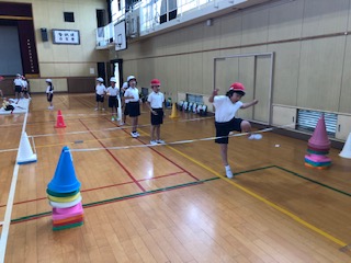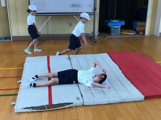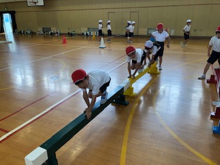 2年生は体育科の学習で体づくり運動をしています。ゴムひもを跳んだり、平均台を渡ったり、マットを転がったりと大忙しです。自分のイメージしたとおりに体を動かすことはなかなか難しいです。低学年の時期にさまざまな動き方を経験し、運動が好きな子になってほしいです。感染症の拡大防止のため、家で過ごす時間が増えています。テレビやゲームだけではなく、たまには子どもたちと体を動かしてみてはいかがでしょう。15分ほどの運動でも、子どもと一緒にすれば、かなり体力を使います。