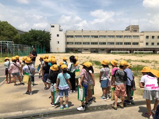 2年生は生活科の学習で町の様子について調べています。今日は、淡路商店街コース、須賀の森公園コース、日之出公園コースにわかれて探検に出かけました。町にある施設を見学したり、公園によって少し休憩したりしながら町を歩きました。子どもたちは「ここは行ったことある」「あのおっちゃん知ってる」と見るもの、出会う人に興味津々でした。暑い中でしたが、久しぶりに学校の外へ出たためかテンションが上がりっぱなしの2年生。はじめのうちは探検ボードにメモをとっていましたが、公園では着いてすぐにベンチに置かれる探検ボード。子どもたちは遊びに夢中でした・・・