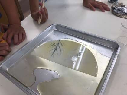 子どもたちの予想通り、日光に当たった葉にはでんぷんがつくられており、青紫色に反応しました。