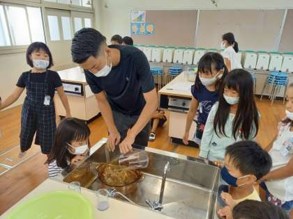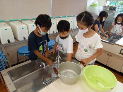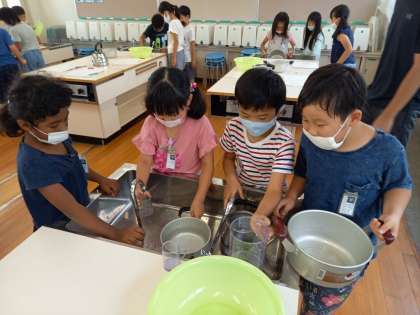各学級で色水やビーカーを使って「かさ」を測るなど、教科書とノートだけでなく、教材を工夫しながら、子どもたちに「かさ」の概念を指導しています。
