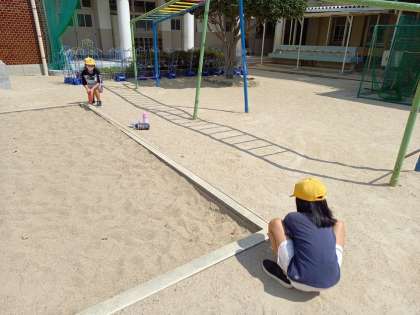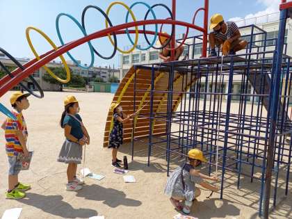 今日は教室だけでなく、校内にある遊具や建物の幅など、巻き尺を使って計測し、実際どれほどの長さがあるのかを調べてみました。