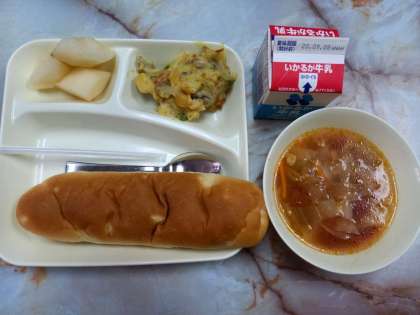 おさつパン 牛乳 豆乳マカロニグラタン トマトスープ 梨