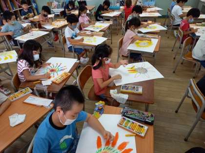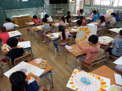 1年生は図画工作の時間に「ひまわり」の絵を描いています。