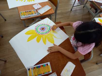 画用紙いっぱいに描かれた大きな「ひまわり」は、1人1人、花びらの色合いや形が違い、見ていてとても楽しいです。
