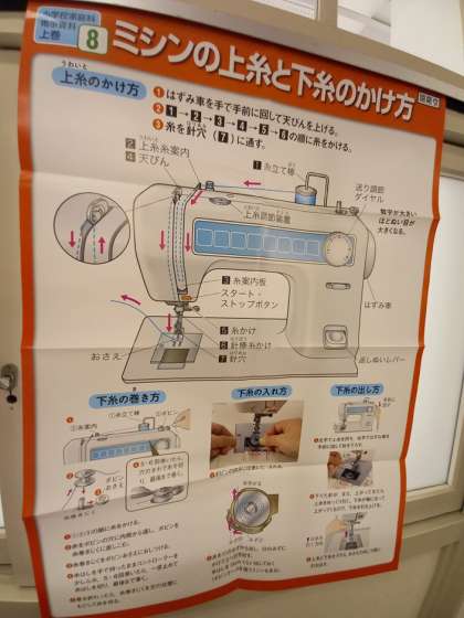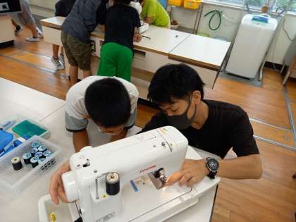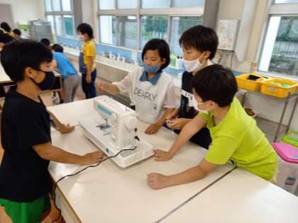 5年生の家庭科では、針と糸を使った裁縫の学習のあと、ミシンを使った制作活動に入ります。
