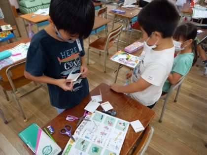 2年生はお家から持ってきた空き箱などの材料を使って「うごくおもちゃ」づくりをしています。