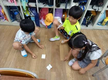 とても簡単につくれるおもちゃですが、どうしたら高く飛び跳ねるか、子どもたちは熱心に考えながらつくっていました。