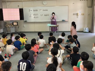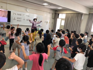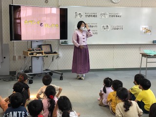 1年生はソンセンニムに来ていただき、韓国語のあいさつやお話を教えていただきました。「アンニョンハセヨ」「コマッスムニダ」などのあいさつをしてから、「ホランイとほしがき」という昔話を聞きました。最後には楽しくじゃんけん。韓国語では「カウィパイポ」という掛け声でじゃんけんします。楽しくいろんな国の文化に親しんでほしいです。