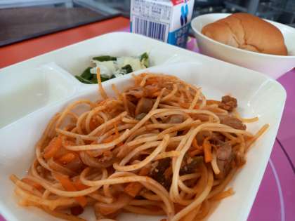 スパゲッティや焼きそばなどの麺料理が主菜の場合、パンは通常の1/2の大きさとなります。
