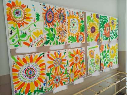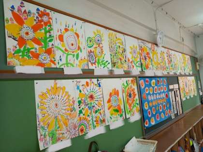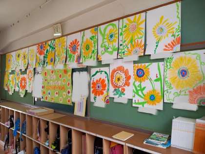 1年生が画工作の時間に描いてきた「ひまわり」の絵が完成しました!