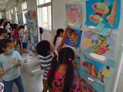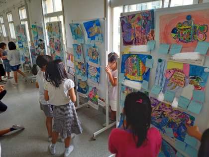 「銀河を泳ぐ不思議な魚」を描いた3年生。