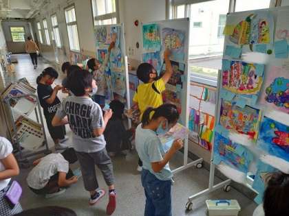 廊下に貼りだされたみんなの作品を鑑賞し、よかったところやすごいなぁ!と思ったところなど、自分が感じたことを付箋用紙に書いて作品に貼っていきます。