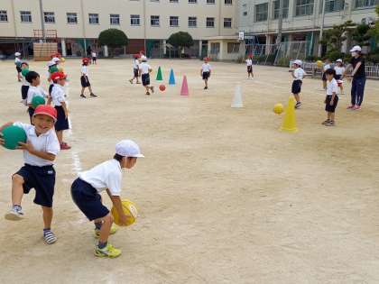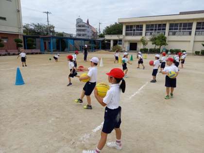 1組は運動場でボール運動、2組は体育館でマット運動をしていました。