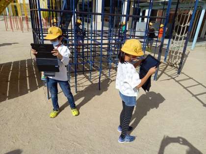 今日は運動場に出て、タブレットを使って「かげ」の写真を撮り、かげのでき方について調べました。
