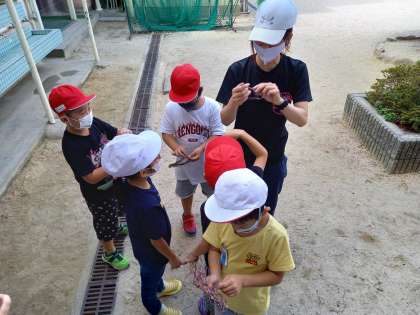 1年生は育てていた“あさがお”が秋になり枯れたあと、“つる”を巻き取ってリースづくりをします。