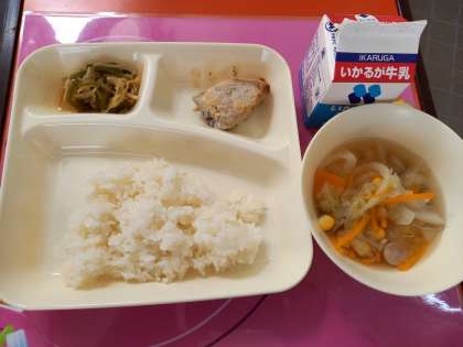 「かつおのマリネ焼き」には、ノンエッグドレッシングが下味で使われており、卵アレルギーに対応した献立になっています。