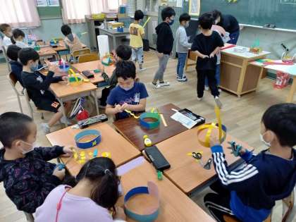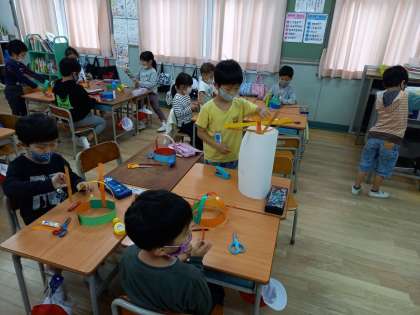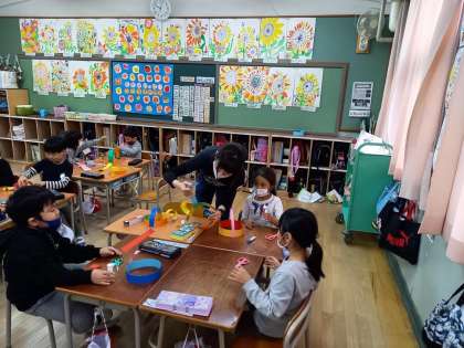 1年生の図画工作は「○○のすてきなぼうしをつくろう」の学習をしています。