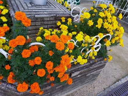 花壇のマリーゴールドも、きれいな花を咲かせています。