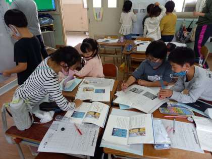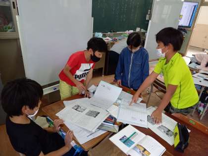 今日はパラリンピックの水泳競技について、教科書の内容から読み取ったことをワークシートに各自でまとめ、グループで要約文を考える学習をしました。