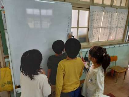各グループにホワイトボードを設置し、1人1人が書いた内容をもとに、「パラリンピックの水泳競技は…」について、60字以内でまとめる練習をしました。