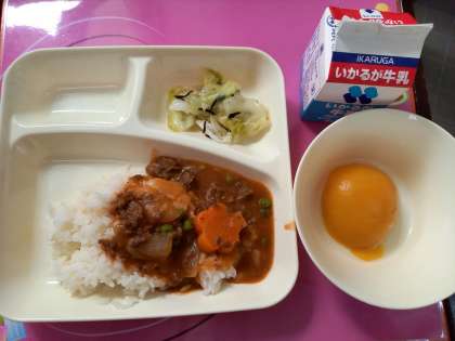 ハヤシライス 牛乳 キャベツのひじきドレッシング 黄桃(缶)
