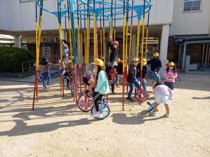 登り棒をつかんでスタートする子が多く、さっとスタートする子、こわごわ?スタートする子など、様々な“試運転”でしたが、どの子も本当にはじけんばかりの笑顔で、一輪車に乗っていました。