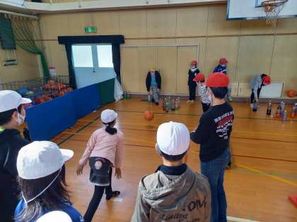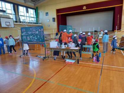西淡路小学校と淡路中学校を会場として、オリエンテーリングが実施され、各ポイントでは、たて割り班が考えたゲームが行われます。お店番とオリエンテーリングに回るメンバーが途中交代をして、秋の1日を楽しみます。