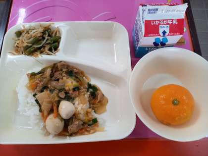 中華丼 牛乳 もやしとさんど豆の中華和え みかん