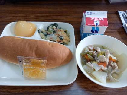コッペパン(マーマレード付) 牛乳 スープ煮 ほうれん草のグラタン 白桃(缶)