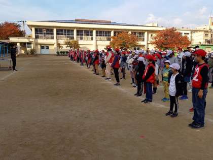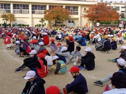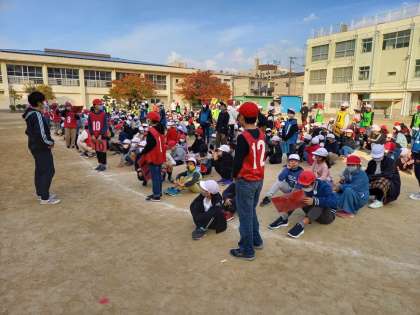 たて割り班による全校集会はこれまで、密になる講堂では行わず、ビデオ撮りしたものや各学級での活動を中心に行ってきましたが、今日は久しぶりに運動場で集まり、集合場所の確認や、簡単なゲームをして時間を過ごしました。