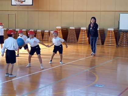 1年生は体育の時間、ボールを使った運動に取り組んでいます。