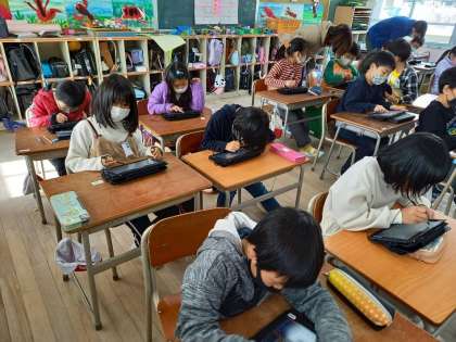 学年が上がるにつれて、タブレットを使った学習も多くなっていきますが、低学年のうちから、「慣れる」学習を行っていきます。
