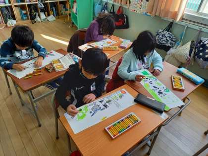「いわいとしお」さんが書いた絵本「100かいだてのいえ」のお話をもとに、1組ではクラス全員(28人)が1枚ずつ絵を描き「28かいだてのいえ」を完成していきます。