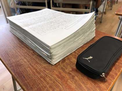 今日までに、何度も繰り返し書き直されてきたクラス全員の下書きが机に置かれていました。その量に驚かされます。記念になる文集の完成は間近ですね。