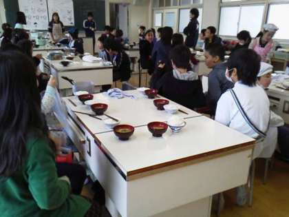 5年生が、家庭科の調理実習で、ご飯を鍋で炊き、みそ汁を作りました。
