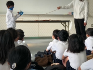 保健指導は「感染症予防」です。教室でマスクをしないで咳やくしゃみをするとウィルスがどこまで飛ぶのかを紐を使って実験しました。